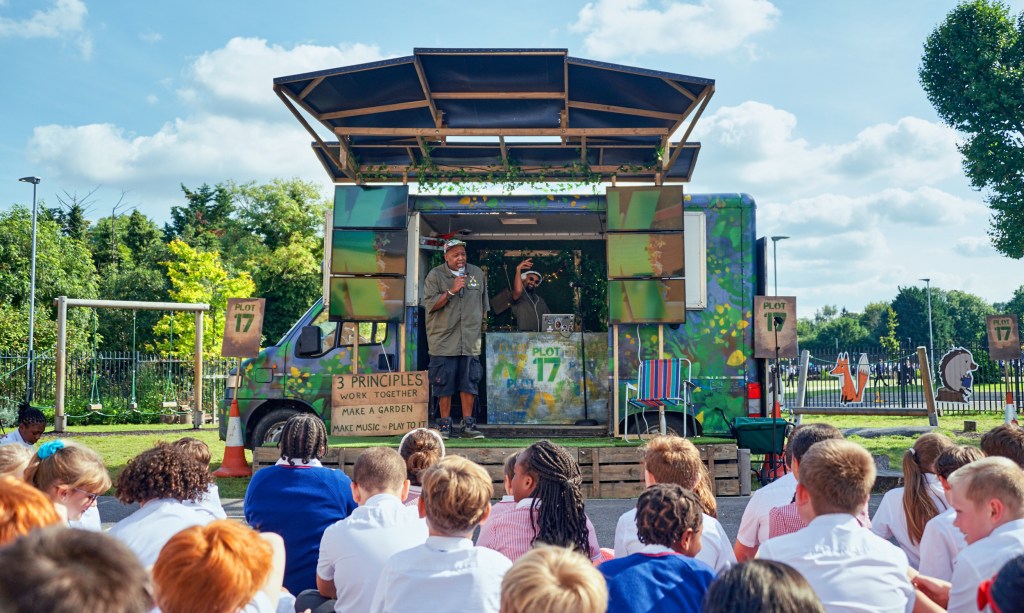 Plot 17, written and performed by Kenny Baraka, with DJ Conrad Kira, touring schools in an adpated horsebox. Set, costume and video design: Paul Burgess. An Apples and Snakes production. Photo Suzi Corker.