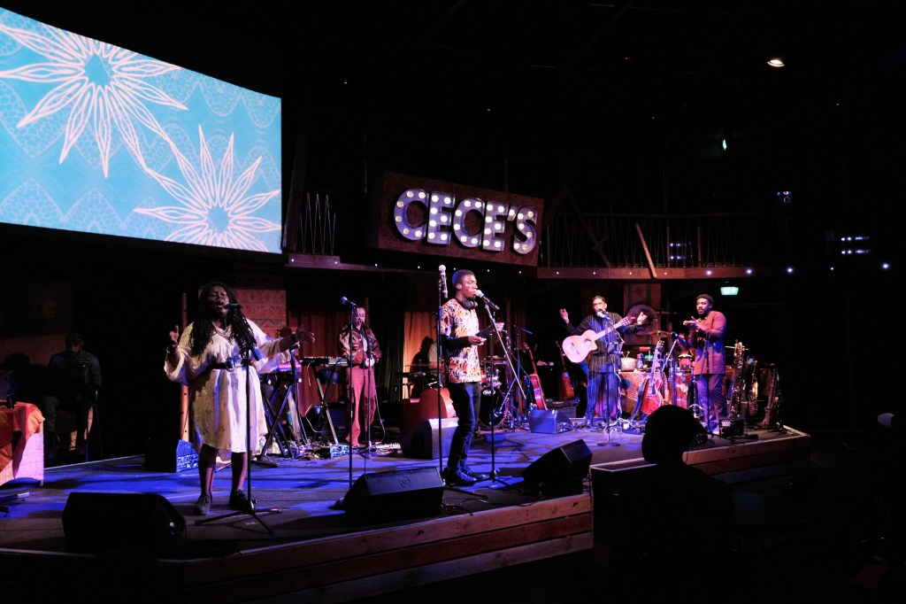 Cece’s Speakeasy, by Apples and Snakes, at The Albany, London. A collaborative project led by Zena Edwards. Set, costume and video design, Paul Burgess. Associate designer: Carly Brownbridge. Featuring Jan Blake, Anthony Johnson, The Repeat Beat Poet, Safiya Kamaria Kinshasa, Amyra León and others. Music director: Eric Appapoulay. Producer: Lisa Mead